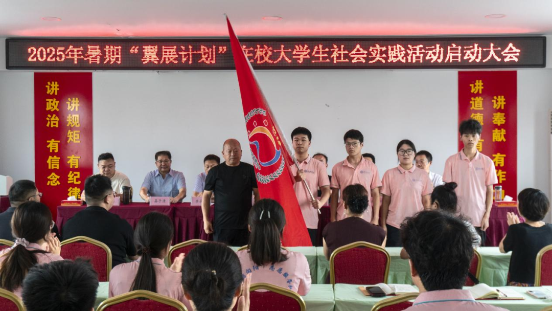 接着,授旗仪式正式开始,王继耀同志手持鲜红的“翼展计划” 实践队队旗,郑重地交到本次计划学生代表手中,学生代表双手接过旗帜,旗帜在会场中迎风飘扬,象征着责任与使命的传递。之后,本次计划学生代表发表了真挚的致辞,表达了参与实践活动的坚定决心。最后,陈庄社区党支部书记闵拥刚同志进行总结发言,他强调不论是暑期“三下乡”活动,还是此次“翼展计划”,都是大学生了解社会、锻炼自我的绝佳契机,鼓励同学们积极投身其中。