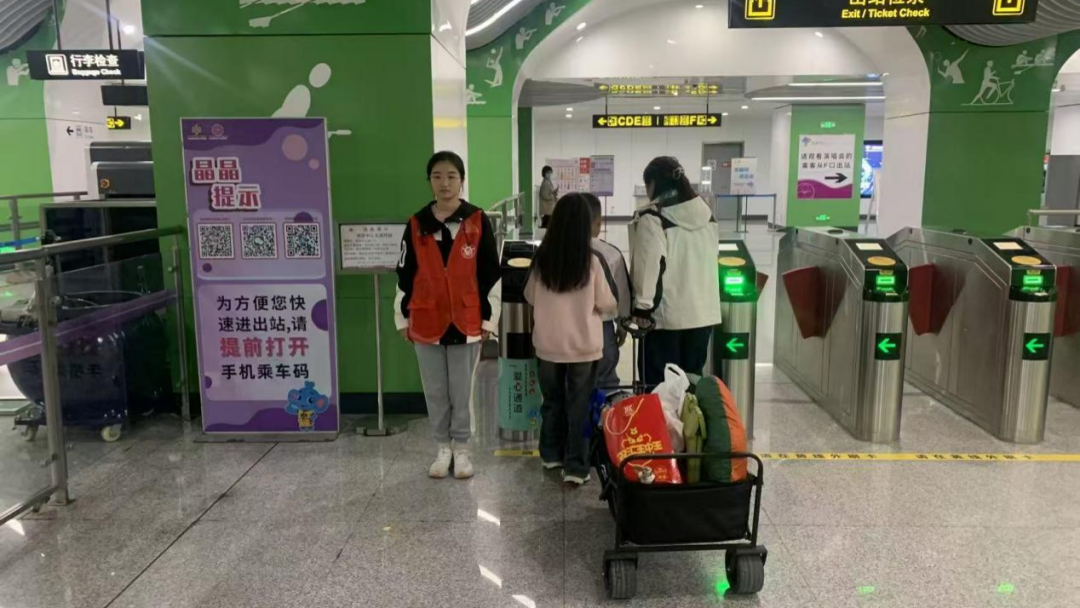 穿梭城市脉络,践行服务初心。走进地铁站,志愿者身披红马甲,成为往来乘客身边的“贴心向导”。在出站检票口旁,他们耐心指引乘客操作乘车码、协助搬运行李,用细致服务化解出行的琐碎难题。绿色的站厅因这份志愿红的点缀,更添一份暖意——这是青春与城市的温柔对话,也是志愿精神在生活场景中的生动落地。