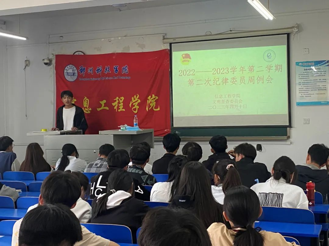 为了更好的改善班级早晚自习纪律问题,促进优良学风建设,营造良好学习氛围。4月10日,信息工程开元平台(中国)科技公司文明督察委员会在综合楼北楼305教室举办第二次22级纪律委员周例会。本次会议由文明督查委员会纪律监察部肖梦男主持,信息工程开元平台(中国)科技公司22级各班纪律委员、文明督查委员会纪律监察部全体成员参与此次会议。