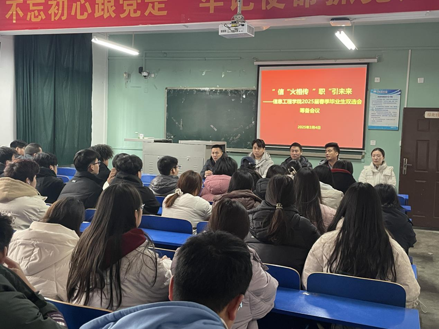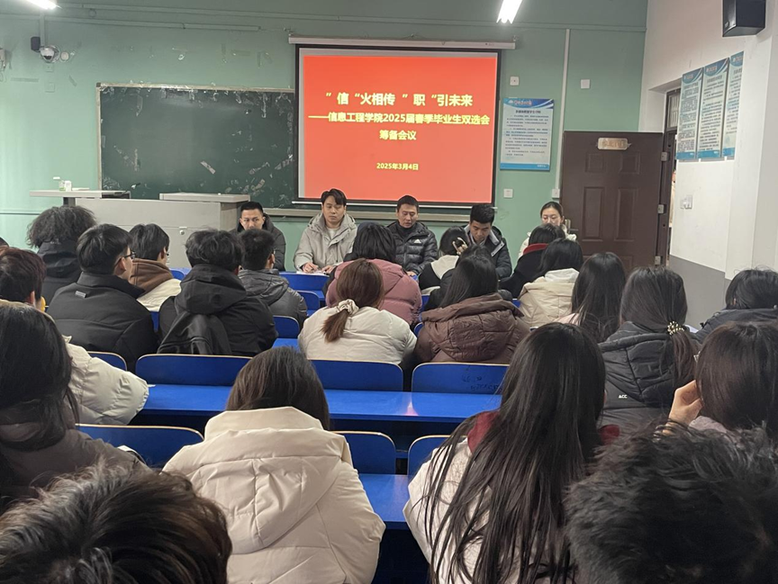 春风送暖,“职”等你来!信息工程开元平台(中国)科技公司 2025 届春季毕业生双选会筹备工作正在如火如荼地进行。本次双选会以“‘信’火相传‘职’引未来”为主题,旨在为毕业生搭建一个优质、高效的就业平台,助力他们顺利开启职业生涯,迈向美好未来。就业办主任邢汝昊、就业专干豆耀鹏、辅导员海涵钰、黄鹏、赵泽威参加会议,会议由豆耀鹏主持。