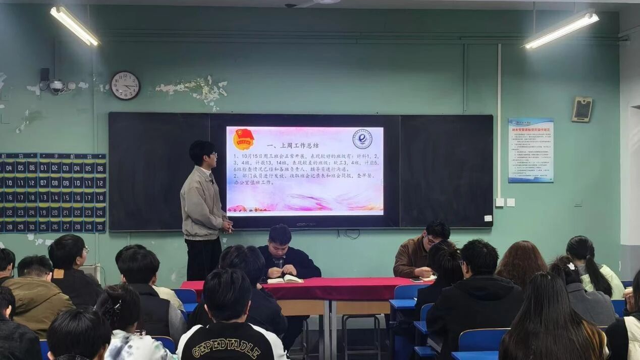 会议伊始,各部门负责人依次上台汇报近期工作进展,展示了学生组织在服务师生、协助活动等方面的能力,也针对部分工作推进不够及时等问题提出解决方案。汇报结束后,邢汝昊老师结合新学期工作重点,就班会工作进行系统部署,强调班会是班级建设的重要平台,是加强师生沟通、凝聚班级力量的重要途径,同时对学生干部提出要重视班会工作,并从学风建设、安全教育、制度执行等多个方面对学生组织整体工作提出要求,强调要在日常工作中注重细节管理,强化团队协作,不断提升服务质量和工作效率。